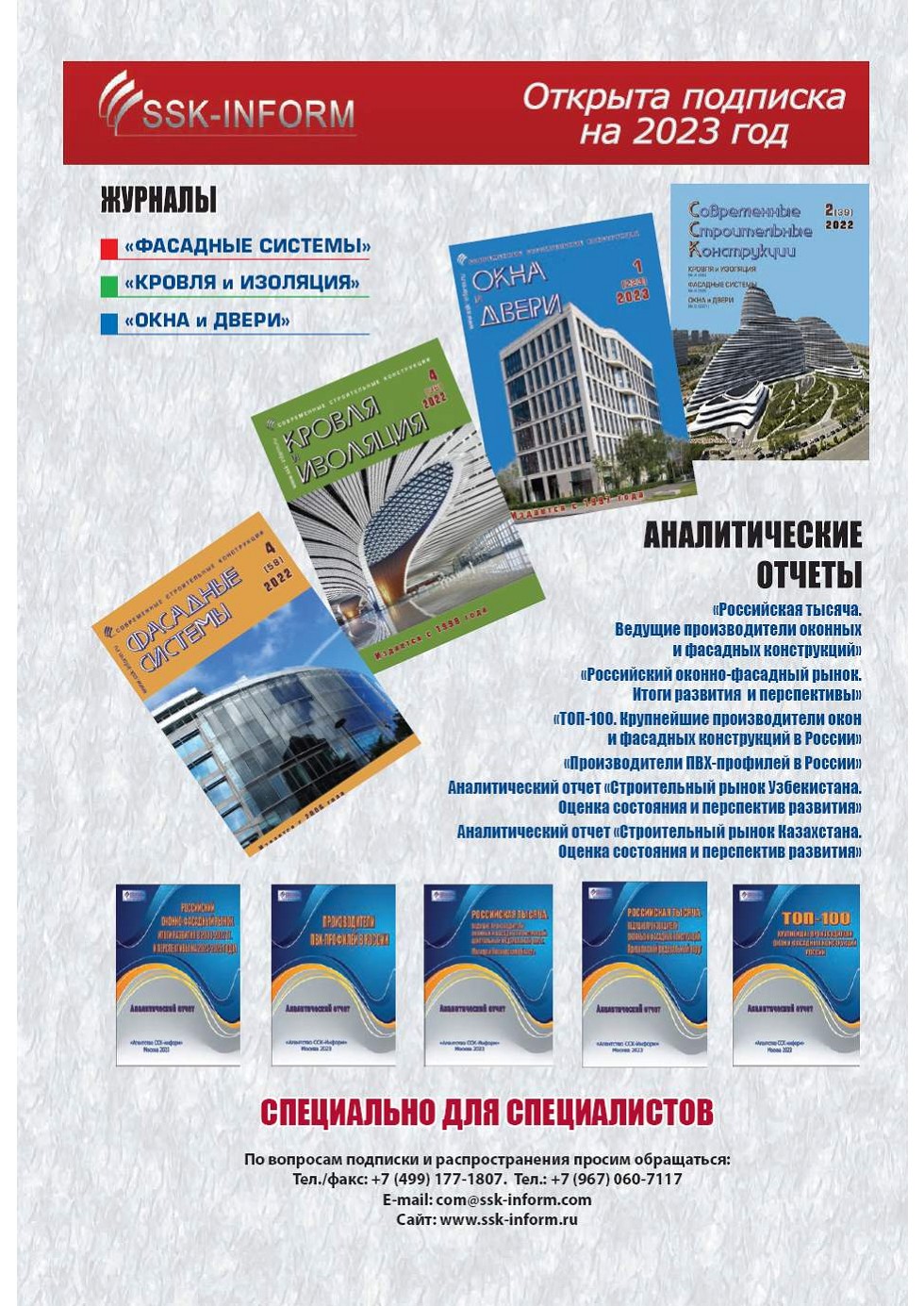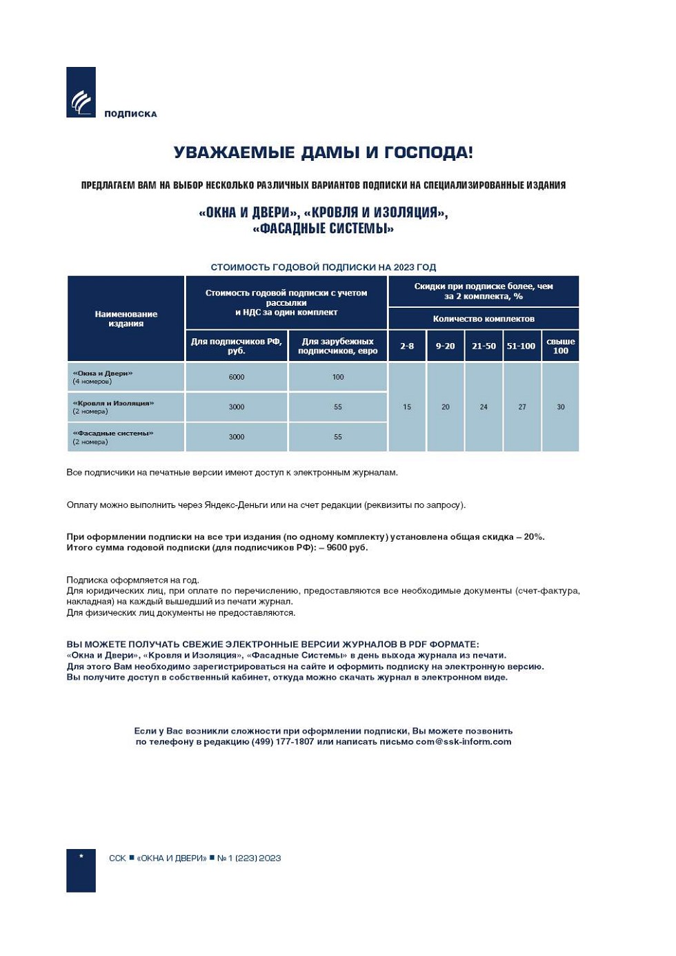 УВАЖАЕМЫЕ ДАМЫ И ГОСПОДА! ПРЕДЛАГАЕМ ВАМ НА ВЫБОР НЕСКОЛЬКО РАЗЛИЧНЫХ ВАРИАНТОВ ПОДПИСКИ НА СПЕЦИАЛИЗИРОВАННЫЕ ИЗДАНИЯ «ОКНА И ДВЕРИ», «КРОВЛЯ И ИЗОЛЯЦИЯ», «ФАСАДНЫЕ СИСТЕМЫ» СТОИМОСТЬ ГОДОВОЙ ПОДПИСКИ НА 2023 ГОД |