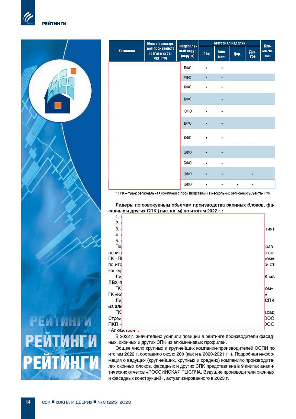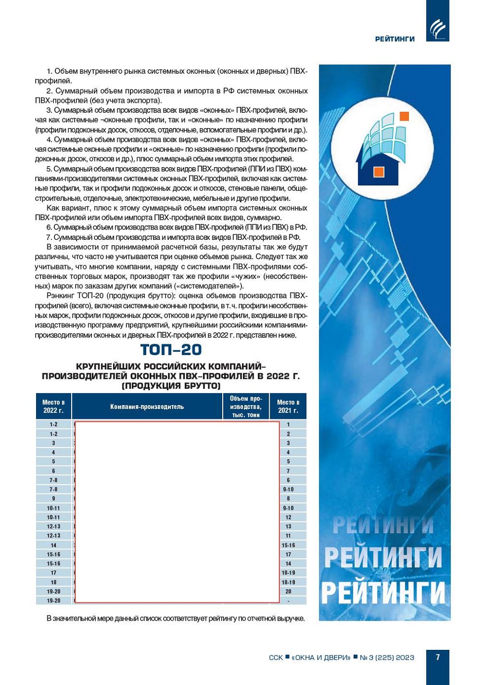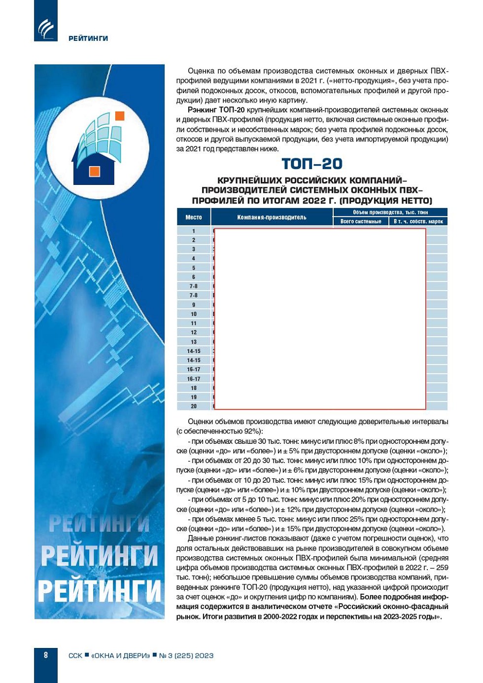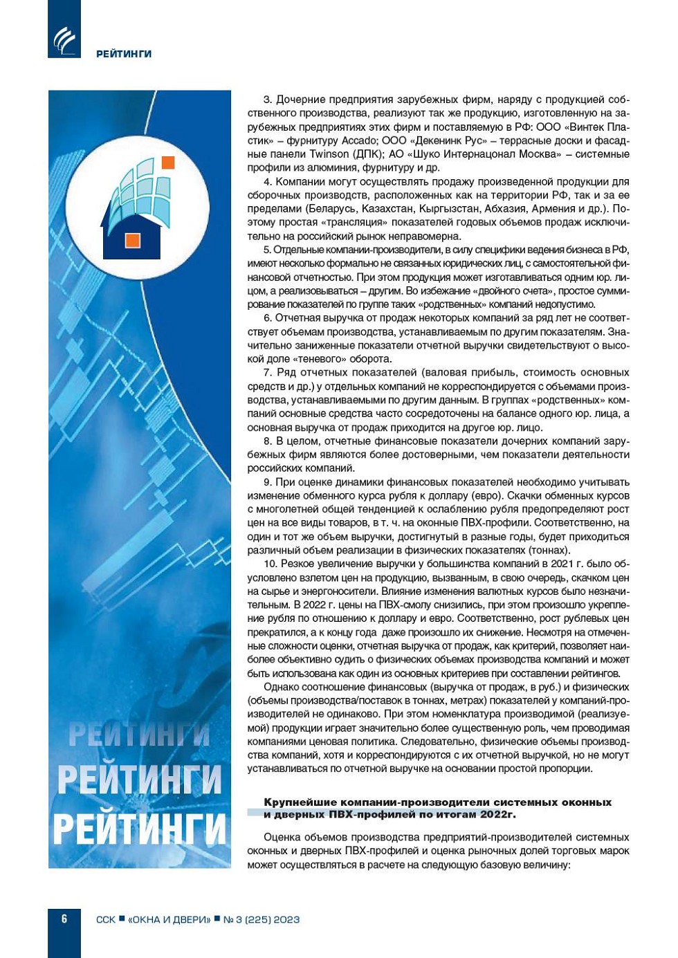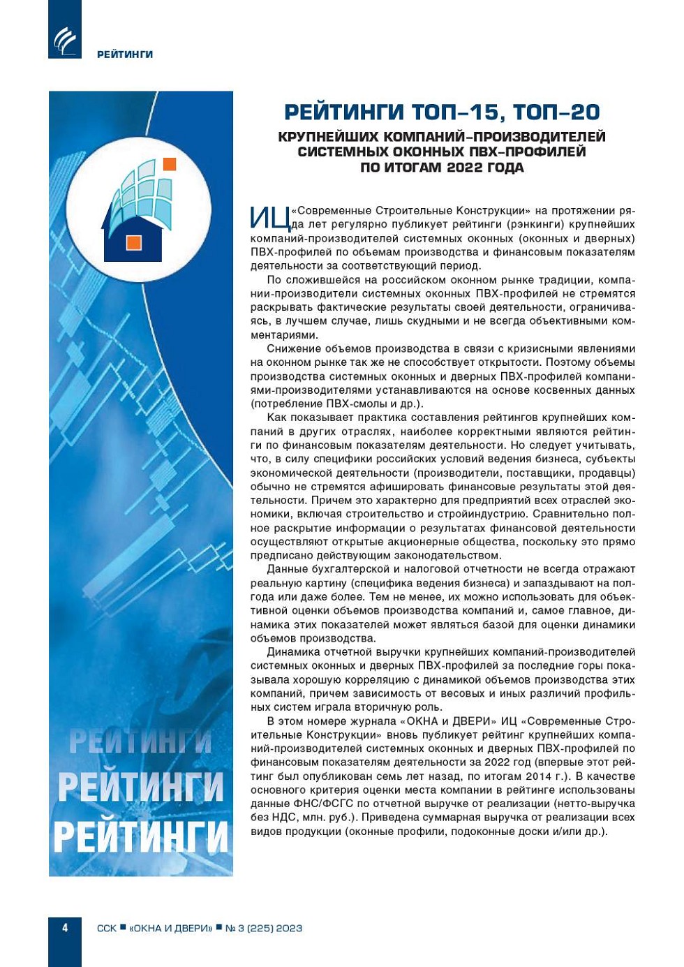 ИЦ «Современные Строительные Конструкции» на протяжении ряда лет регулярно публикует рейтинги (рэнкинги) крупнейших компанийпроизводителей системных оконных (оконных и дверных) ПВХпрофилей по объемам производства и финансовым показателям деятельности... |