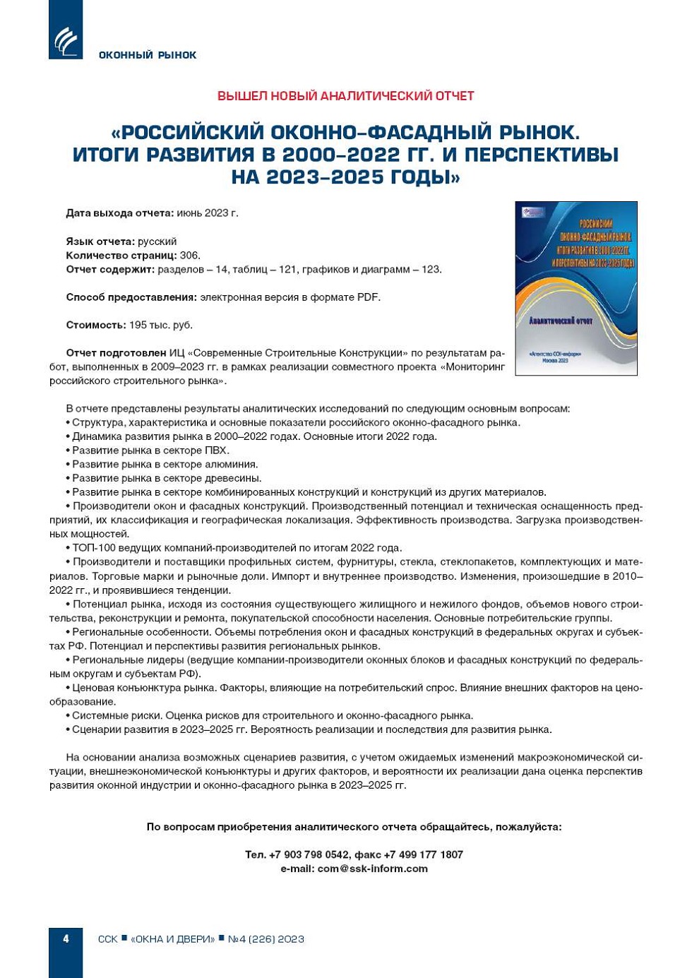 Отчет подготовлен ИЦ «Современные Строительные Конструкции» по результатам работ, выполненных в 2009–2023 гг. в рамках реализации совместного проекта «Мониторинг российского строительного рынка». |