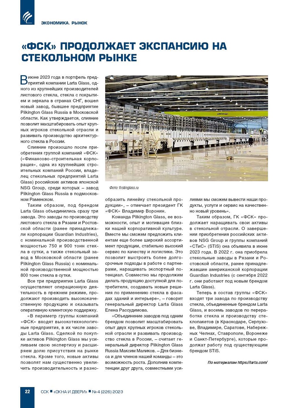 В июне 2023 года в портфель предприятий компании Larta Glass, одного из крупнейших производителей листового стекла, стекла с покрытием и зеркала в странах СНГ, вошел новый завод, бывшее предприятие Pilkington Glass Russia в Московской области. |