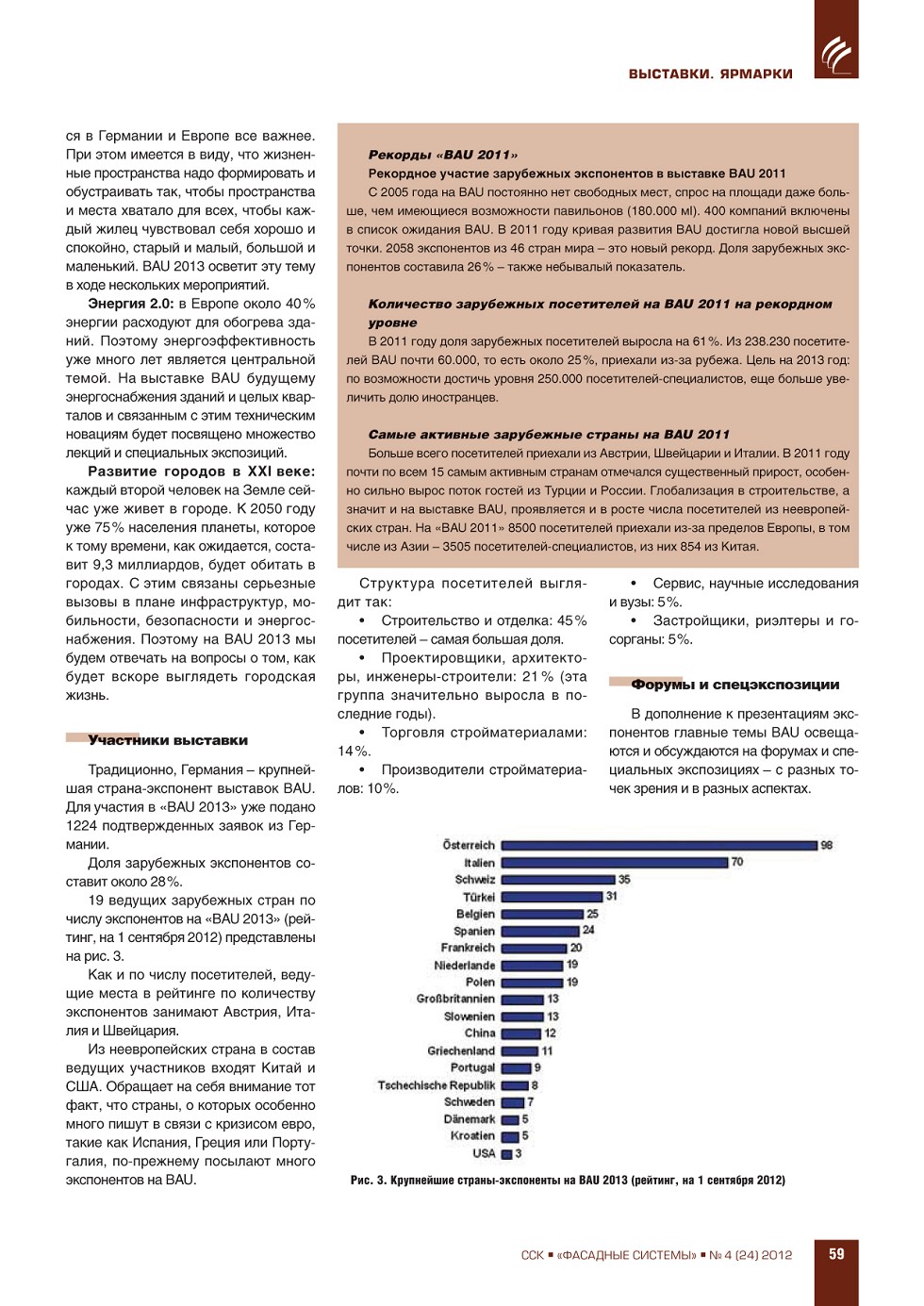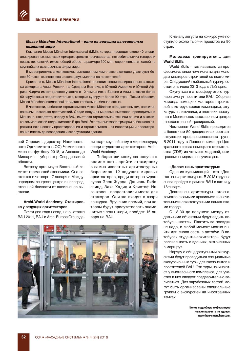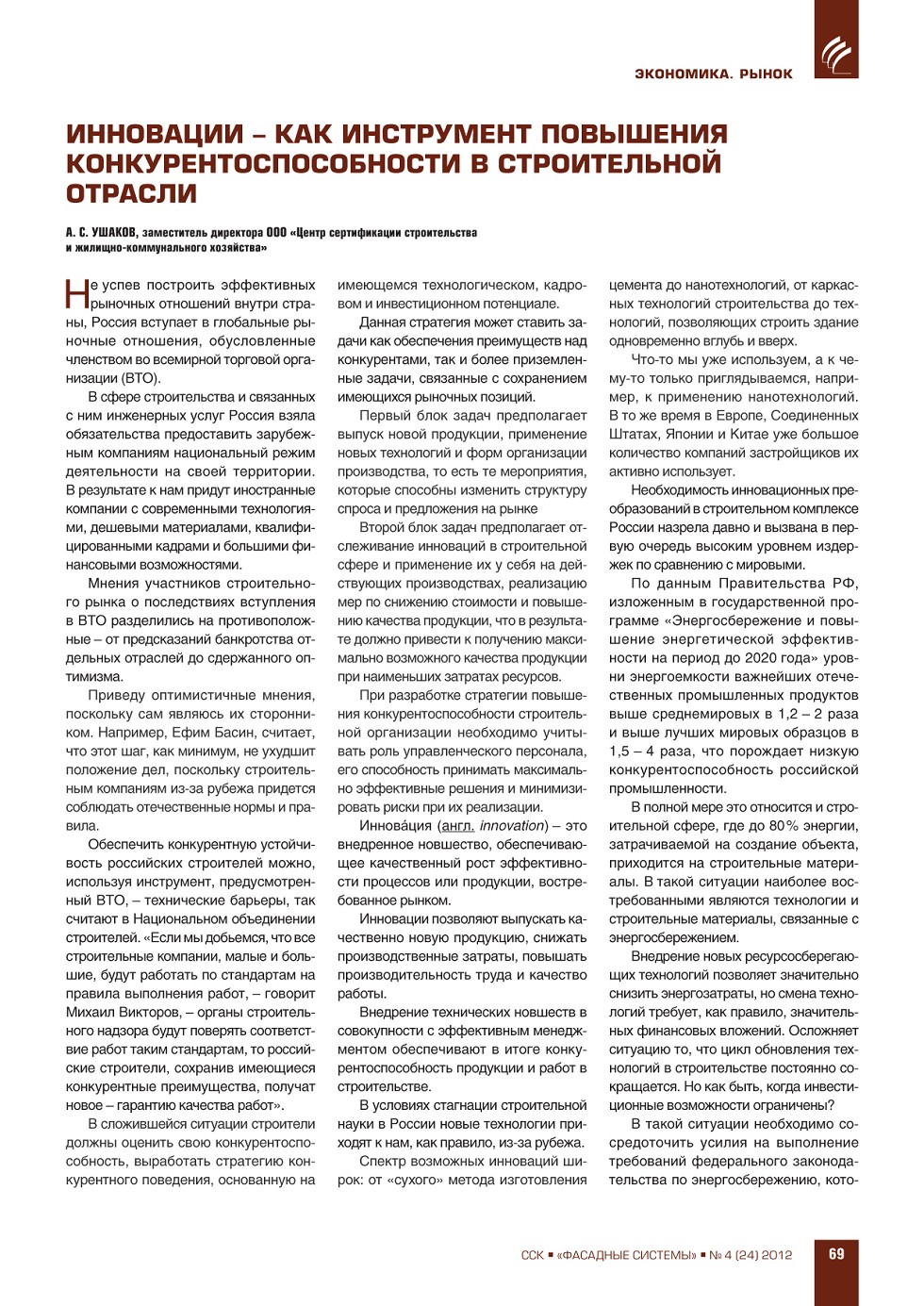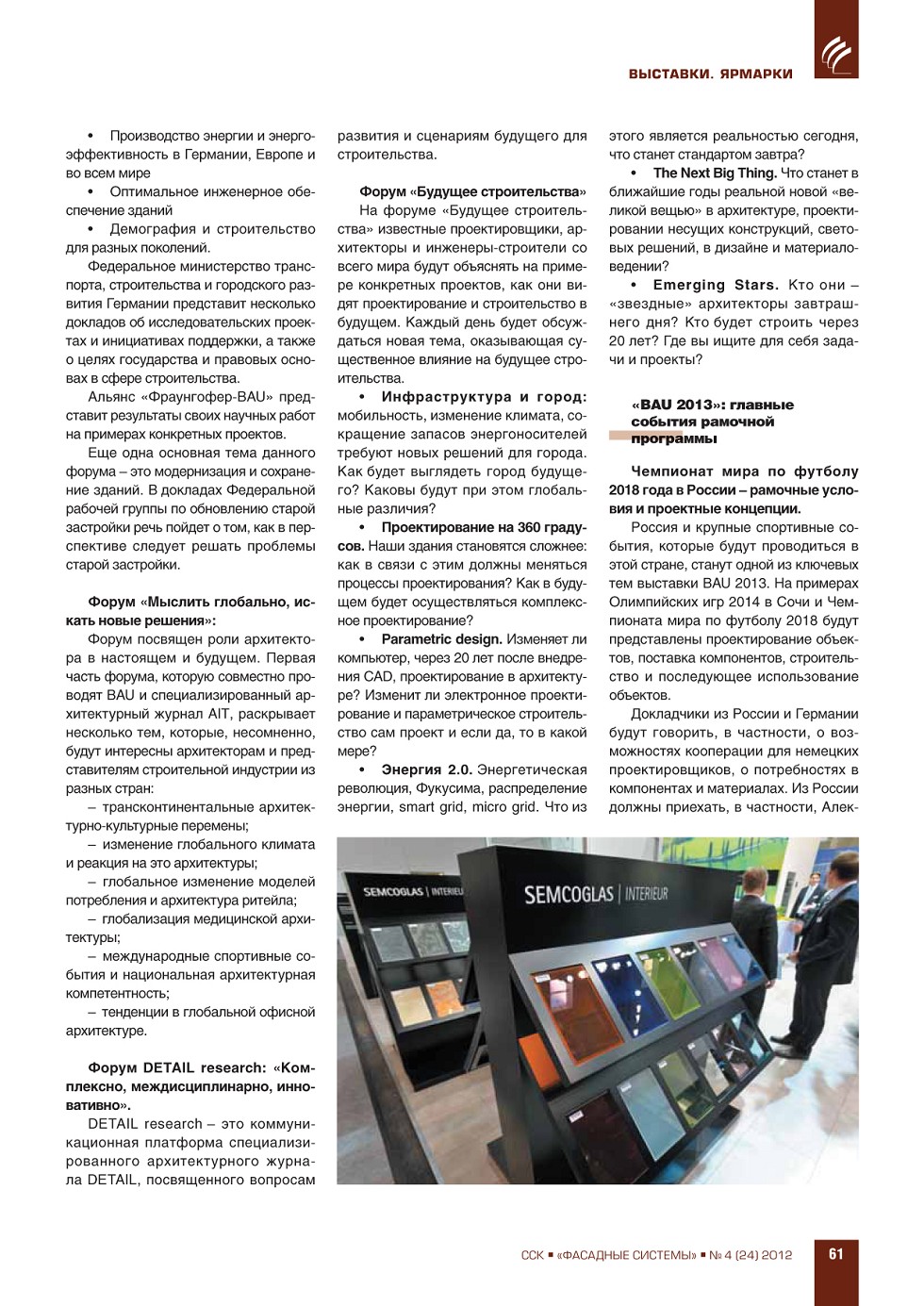 ФАСАДНЫЕ СИСТЕМЫИздается с 2006 г.ПодпискаГрафик выходаСвежий номерАрхивРубрики ЖУРНАЛ ФАСАДНЫЕ СИСТЕМЫ 4 (24), 2012 ССК-Информ » Фасадные системы ВЫПУСК «4 (24)», 2012 СОДЕРЖАНИЕ ВЫСТАВКИ. ЯРМАРКИ Презентация выставки «BAU 2013» в Москве ...56 ЭКОНОМИКА. РЫНОК Н.Л. Гаврилов-Кремичев, И.Л. Николаева. Рынок рольставен, ворот и солнцезащитных конструкций в России ...63 А.С. Ушаков. Инновации – как инструмент повышения конкурентоспособности в строительной отрасли ...69 ПРЕВЬЮ ЖУРНАЛА