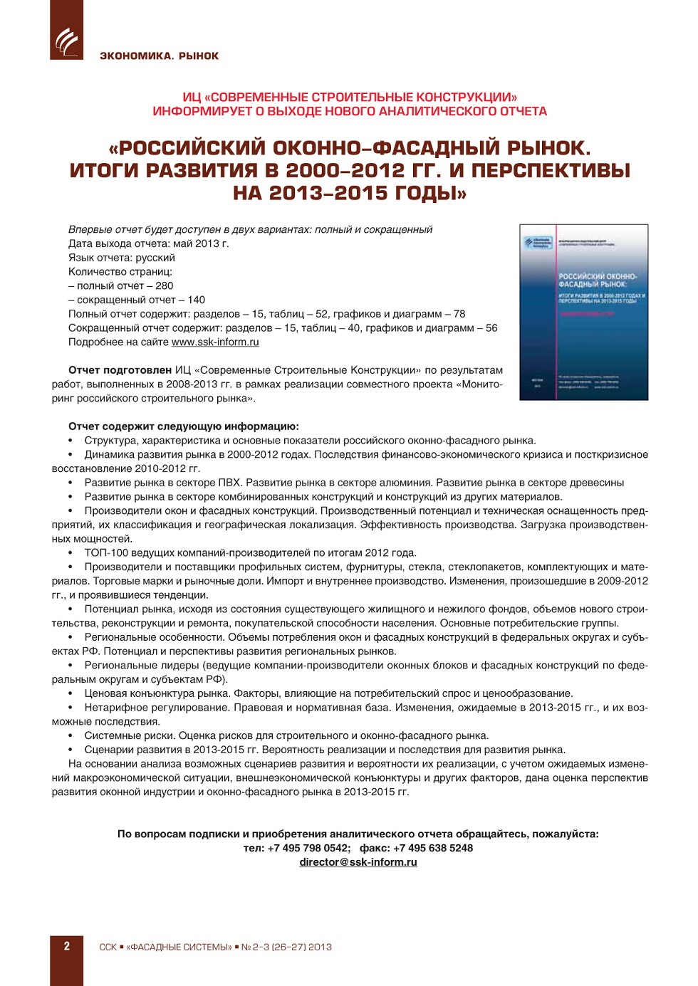 | Новый аналитический отчет «Российский оконно-фасадный рынок. Итоги развития в 2000-2012 гг. и перспективы на 2013-2015 годы» | ...2 |