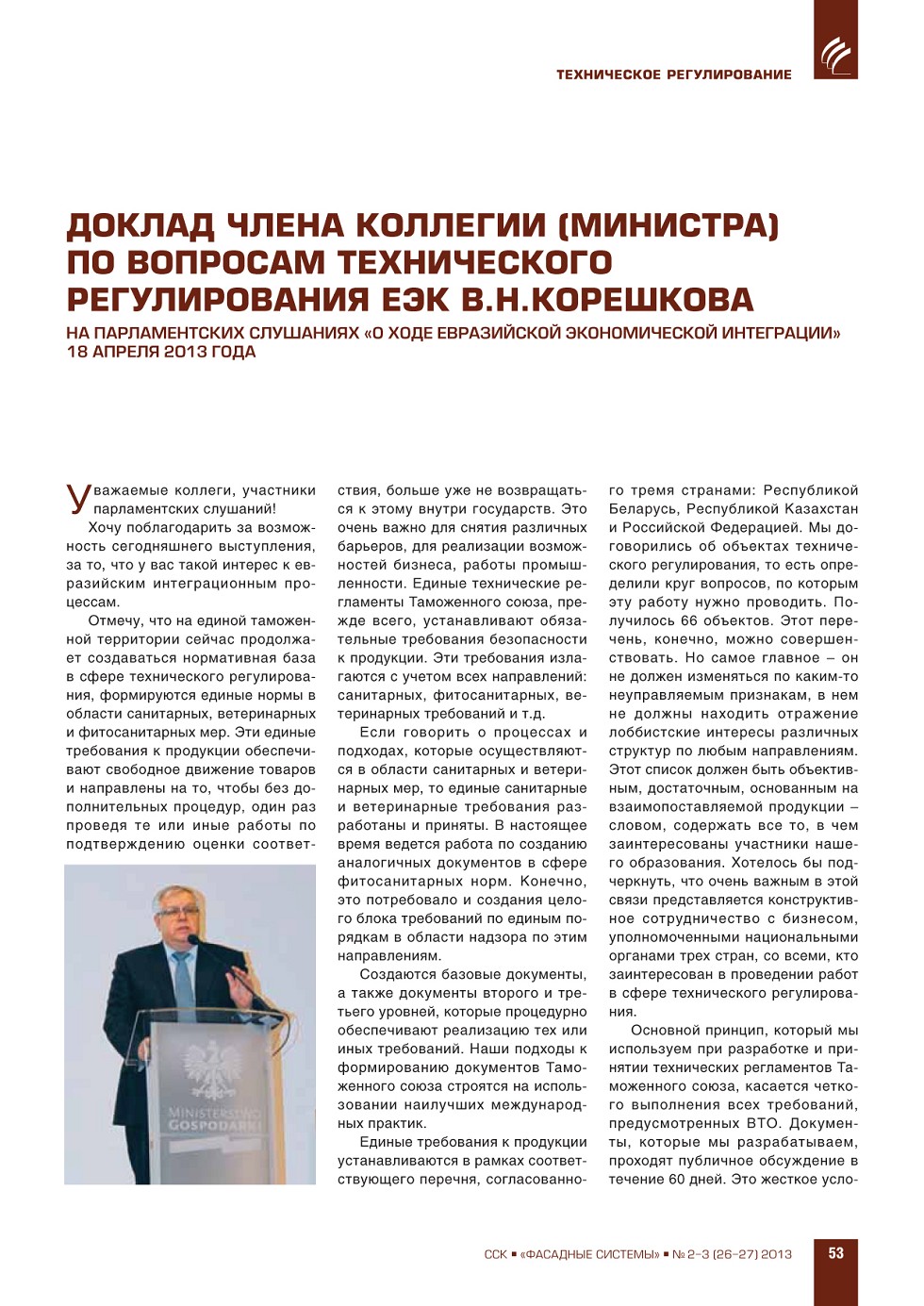 | Доклад члена коллегии (министра) по вопросам технического регулирования ЕЭК В.Н.Корешкова | ...53 |