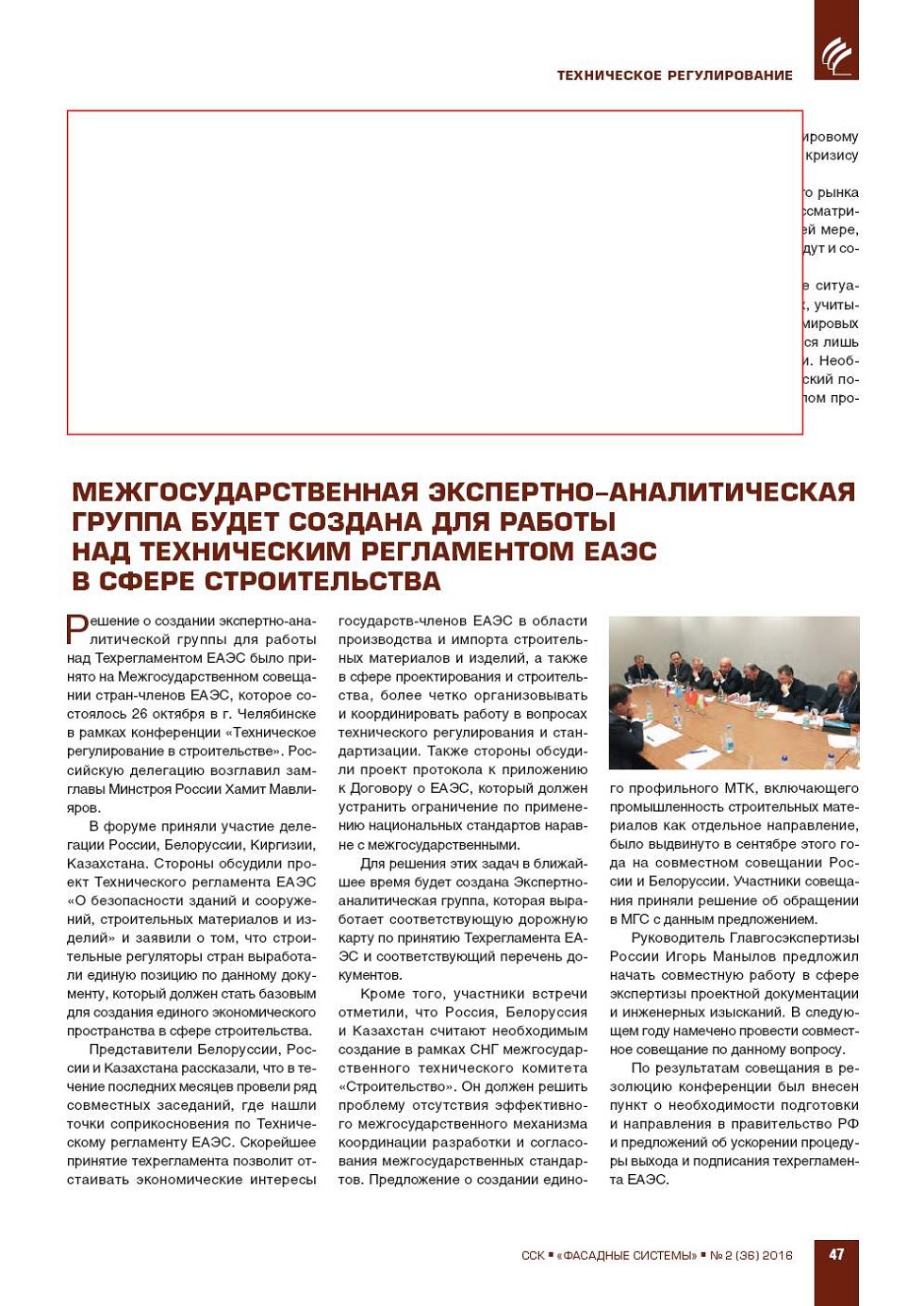 Решение о создании экспертноаналитической группы для работы над Техрегламентом ЕАЭС было принято на Межгосударственном совещании странчленов ЕАЭС, которое состоялось 26 октября в г. Челябинске в рамках конференции «Техническое регулирование в строительстве». |