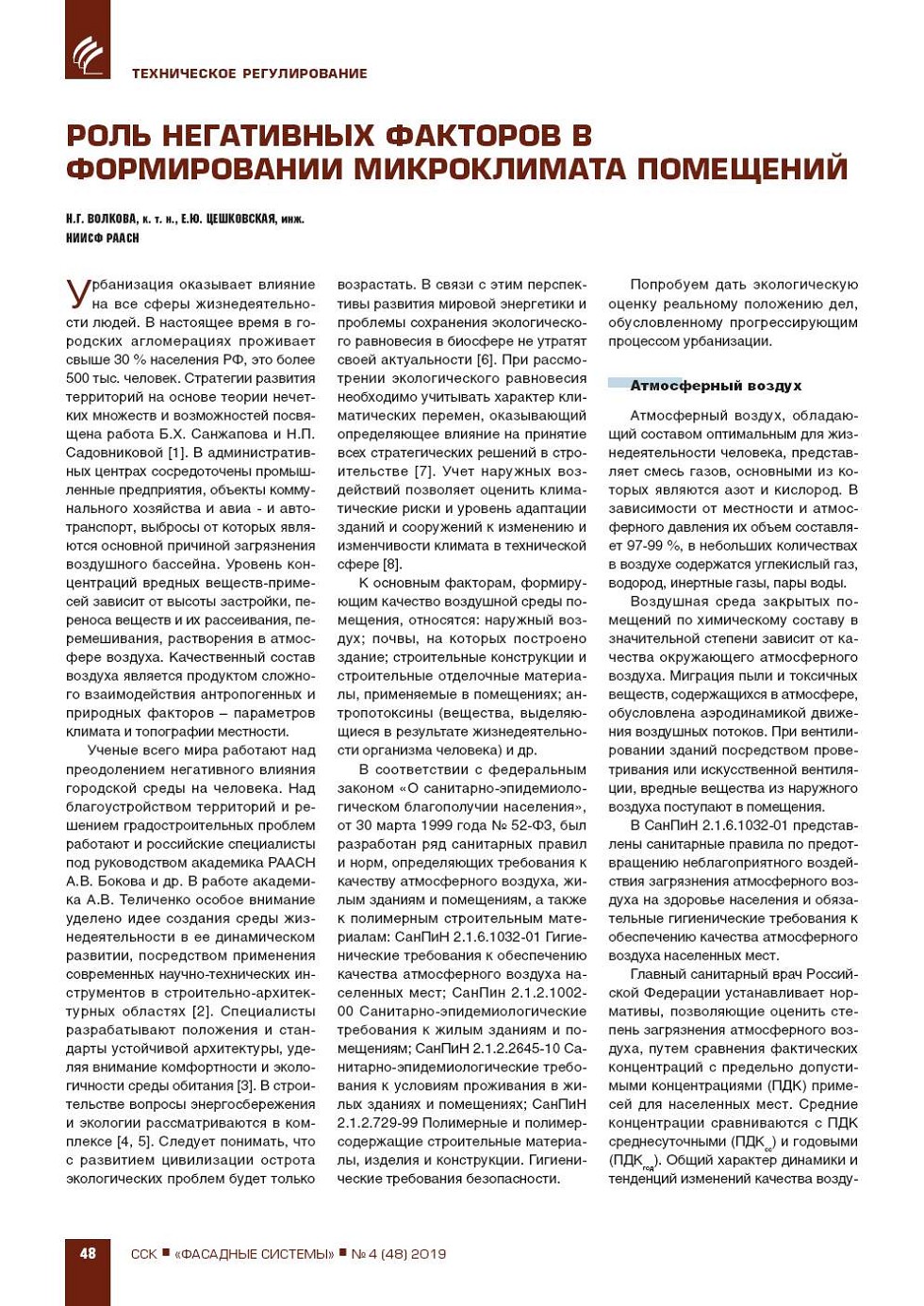 Н.Г. Волкова, к. т. н., Е.Ю. Цешковская, инж. НИИСФ РААСН. Роль негативных факторов в формировании микроклимата помещений