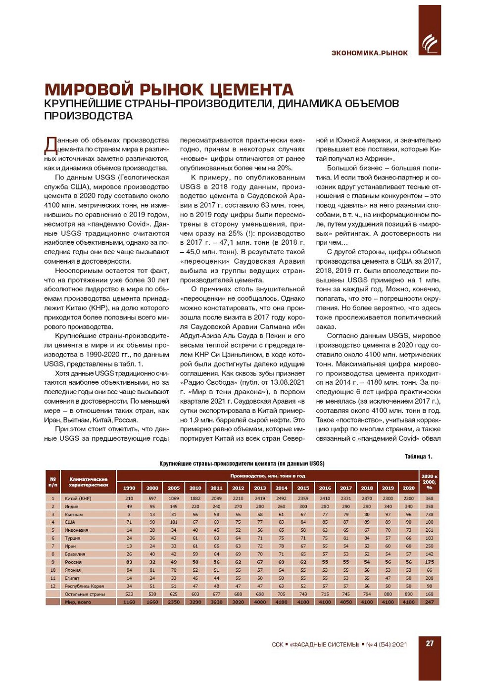 Данные об объемах производства цемента по странам мира в различных источниках заметно различаются, как и динамика объемов производства. По данным USGS (Геологическая служба США), мировое производство цемента в 2020 году составило около 4100 млн. метрических... |